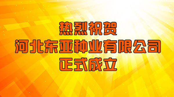 为了拓宽销售渠道,完善销售网络,2016年8月15日河北东亚种业有限公司在石家庄市正式成立,注册资金伍佰万元,服务范围覆盖整个河北省地区。公司成立后,将作为东亚种业全国网络布局的重要组成部分之一,秉承东亚种业"以诚待人,以德兴业"的经营理念,以更好的服务经销商和农户为己任,打造民族种业品牌,共创中国种业辉煌!