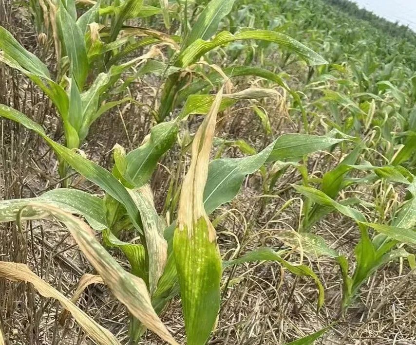 雨水频繁,高温高湿加上田间玉米植株密度过大,病菌传播速度快,褐斑病易发。