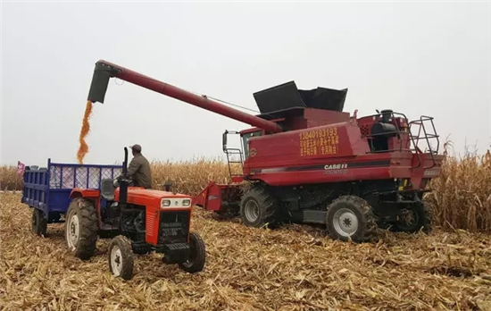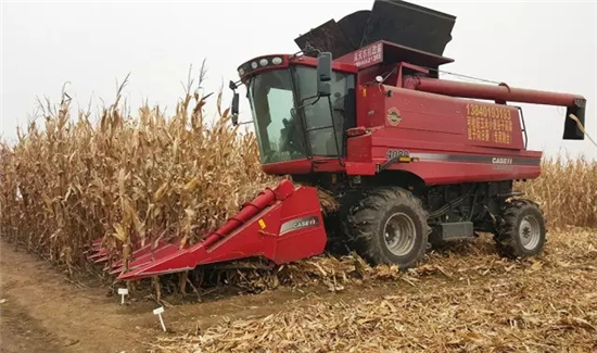 现场机收机脱粒,摘穗、秸秆粉碎、剥皮、脱粒、清选一气呵成,金黄的玉米粒倾斜而出,品种好机收不掉粒不碎粒。
